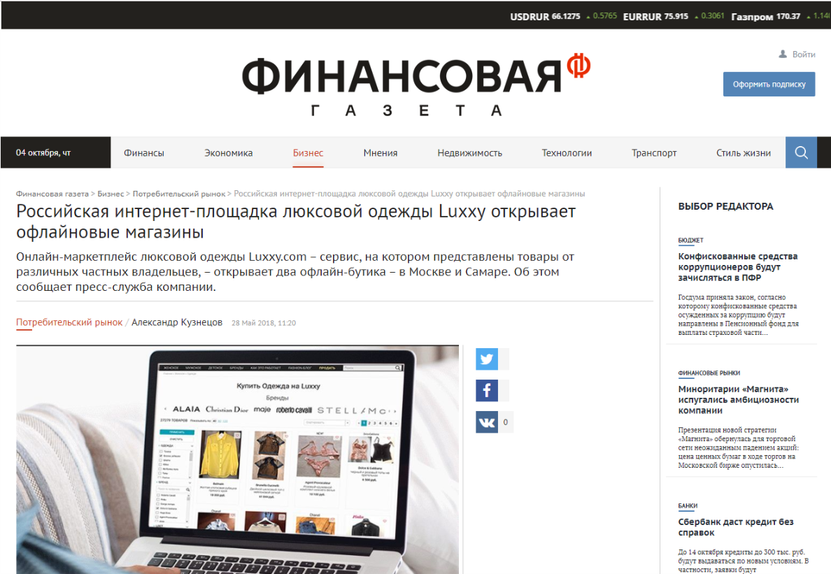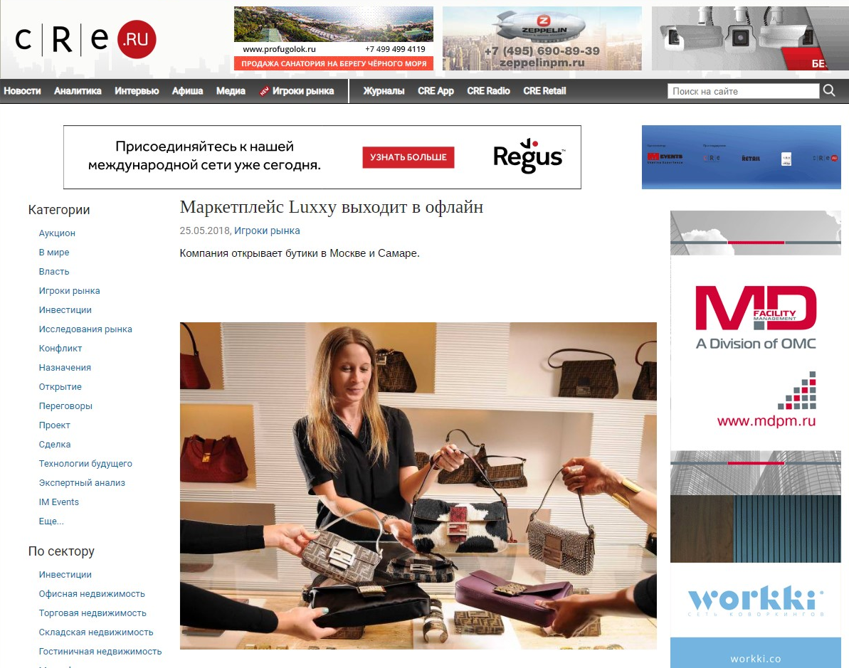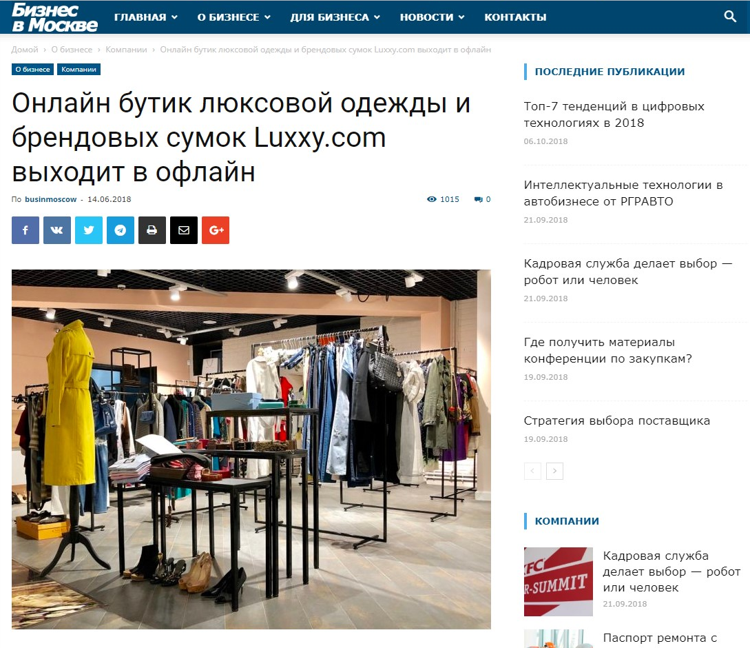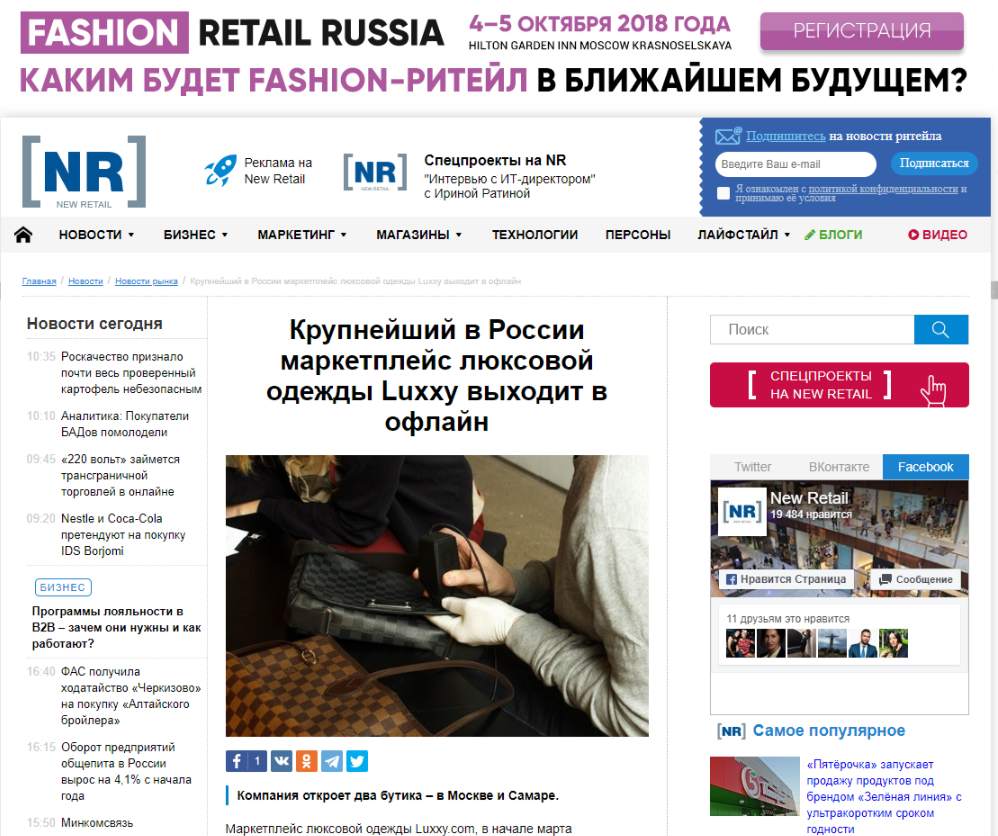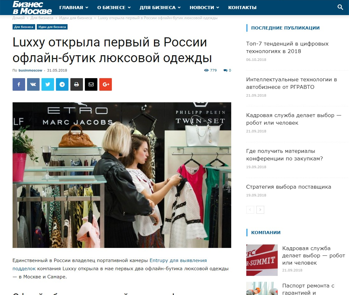Маркетплейс люксовой одежды Luxxy.com, в начале марта презентовавший в Москве единственный в России прибор для машинной аутентификации Entrupy, в мае 2018 открывает два офлайн-бутика - в Москве и Самаре.Российский стартап, действуя по принципу омниканальности, успешно осваивает растущий вторичный рынок люксового сегмента. Продажи на проекте стартовали в мае 2017 года, и за первый месяц на сайте было продано товаров на сумму 260 тыс. руб. В апреле 2018 года - на сумму 10 млн руб.